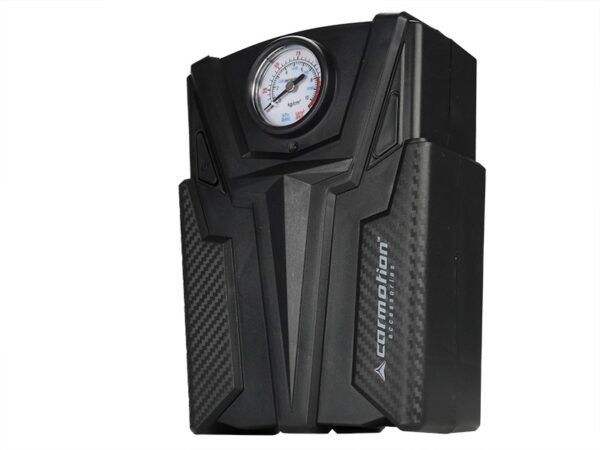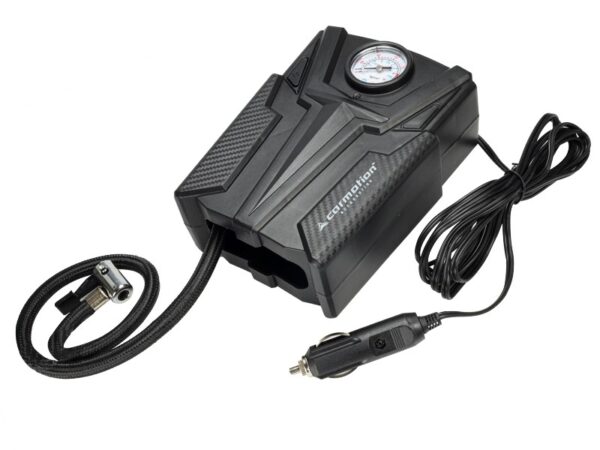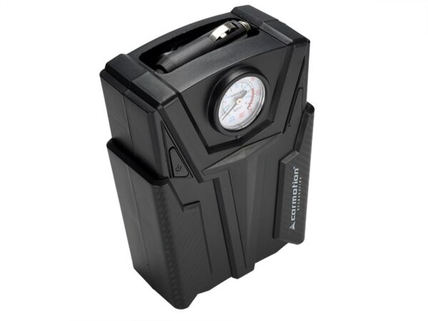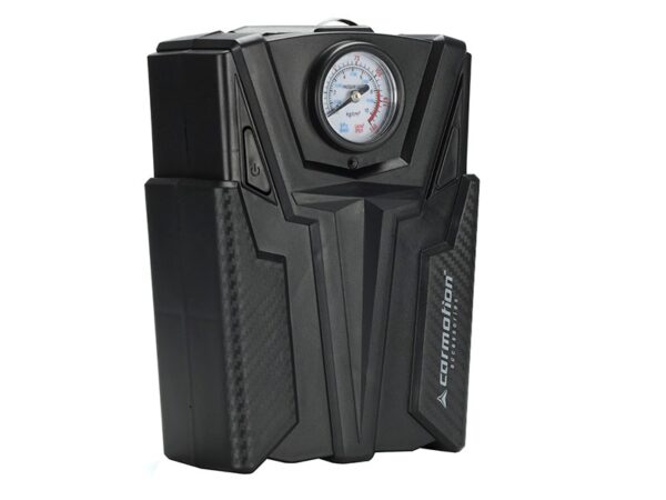 The compressor is powered by a 12V DC cigarette lighter socket. It is equipped with an analog pressure gauge and an LED flashlight. The back of the case has a pouch for adapters. The ergonomic shape facilitates storage in the trunk.
