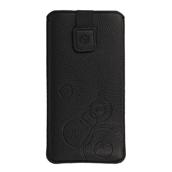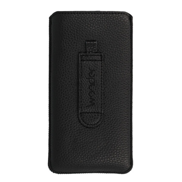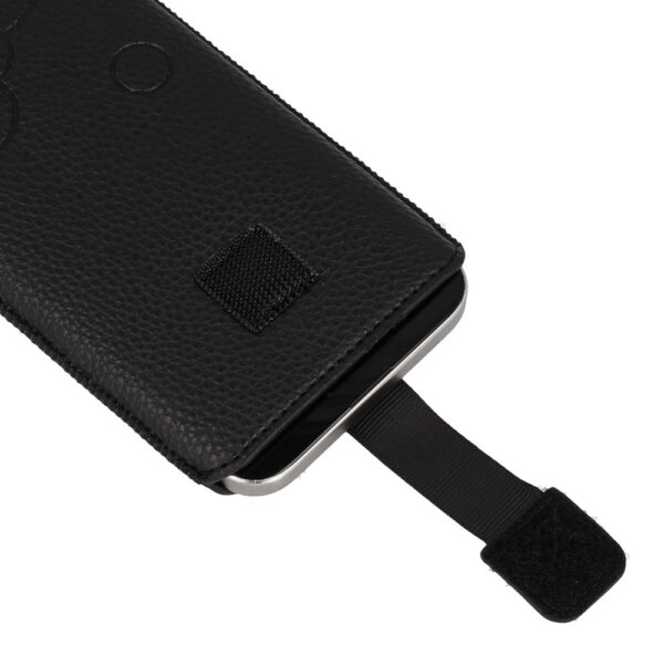 Telefon wsuwany jest od górnej części pokrowca a zapięcie na rzep zapobiega jego wypadnięciu. Znajdujący się wewnątrz etui pasek PULL-UP pozwala w prosty i szybki sposób wysunąć nasz telefon. Wytłoczony logotyp na zapięciu nadaje mu elegancji.