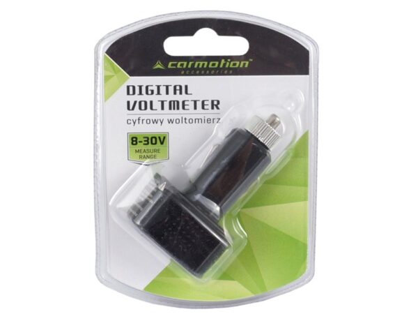 The voltmeter is intended for measuring battery voltage via the cigarette lighter socket in vehicles with 8-30V power supply. It is designed for 12V and 24V installations. It is equipped with a digital display.