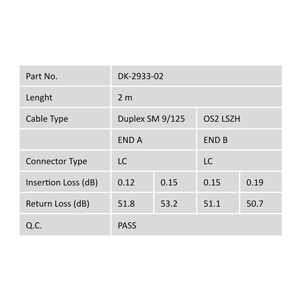 | Kitos savybės | Cable diameter 3 mm; Cable type: I-VH 2E9/125µ; Fiber diameter: 09/125µ; Connector 1/2: LC/LC |