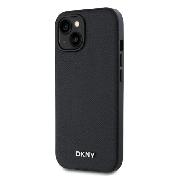 DKNY PU Leather Silver Metal Logo Magsafe dėklas telefonui Apple iPhone 14 juodos spalvos