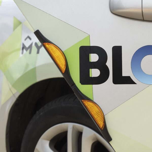 Door bumpers made of flexible material. They have universal size, which makes it possible to mount them not only on the car door, but also on the hatch of the vehicle. Reflectors attached to the bumpers make the open door more visible.