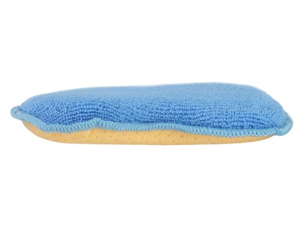 Dimensions: 17 x 11 x 2 cm. One side of the sponge is finished with chamois leather, intended for wiping foggy windows and mirrors. On the other hand, the side covered with microfiber (delicate) allows you to dry and wipe without risk of scratches and marks.