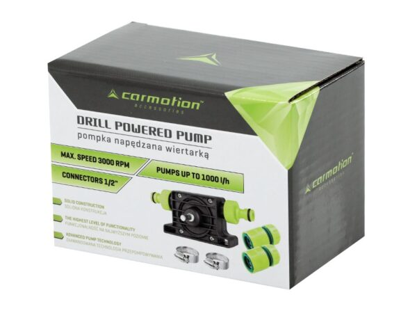 Drill-driven pump, 3/4″ connections + 1/2″ adapters & 2 worm drive hose clamps
