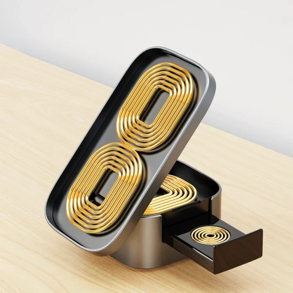 With the Dudao A11Pro+ charger, you can charge your phone, smartwatch and headphones at the same time. At the front of the charger there is a place for a smartphone, at the back for headphones, and the watch can be placed in a special, retractable module. This means no more tangled cables and no more clutter on your desk.