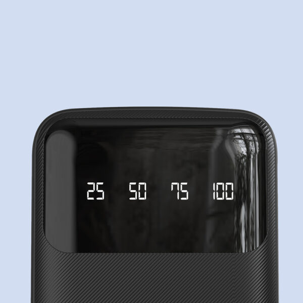 - Charge level indicator – The built-in indicator shows in% the remaining amount of electricity stored in the power bank. You can easily check its charge level by clicking the button on the side of the housing. The display will show the remaining amount of energy as a percentage, and you will know when to top up your power bank.