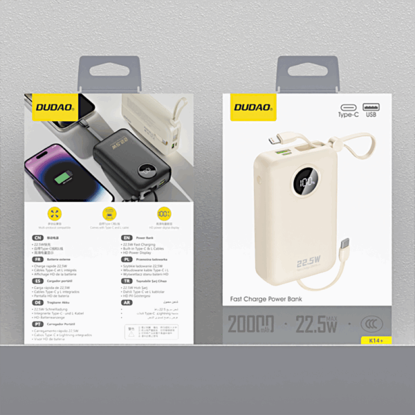 The 20,000 mAh battery allows you to charge your smartphone or other accessories multiple times without having to frequently recharge the power bank itself. The Dudao K14+ is perfect for long days away from home, trips, or intensive use of multiple devices simultaneously.