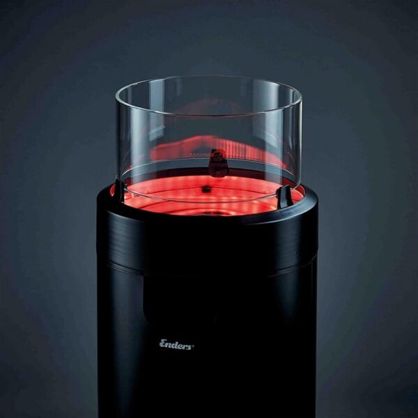 Prekės ženklas- Enders. Artikulas- 560133. Ilgis- 360 mm. Plotis- 360 mm. Aukštis- 1020 mm. Spalva- Juoda. Medžiaga- Stiklas, Nerūdijantysis plienas. Šildytuvo tipas- Pastatomas. Galia- 2500 W. Kuro sąnaudos- 0.172 – 0.182kg/h. Tinkamas kuras- Dujos. Šildymo intesyvumo reguliavimas- Ne. Uždegimo tipas- Elektroninis. Šilumos spinduliavimas- Stiklo vamzdis. Garantija- 24 mėn. Apsauga nuo dujų nuotėkio- Taip. Papildoma informacija- Degimo laikas (dujų balionas 11 kg): 61-152 val. Su LED apšvietimu..