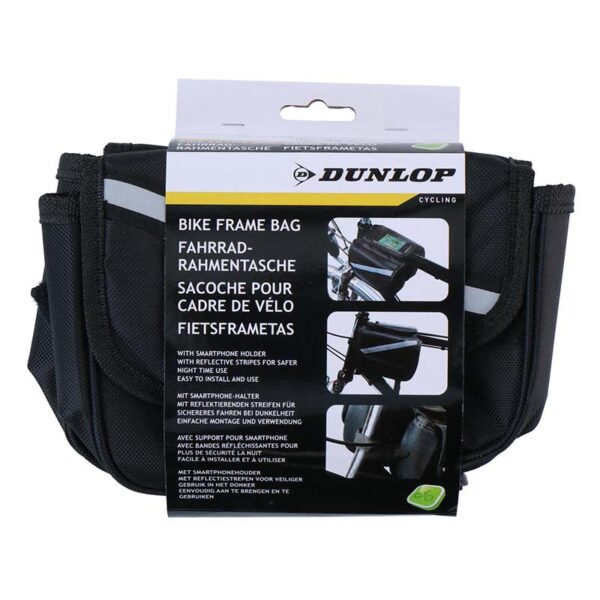 Dunlop bike frame pannier with space for a smartphone. Attached with Velcro for easy mounting and dismounting. Side pockets with Velcro closure are ideal for storing small items. The top of the pannier is equipped with a case with a transparent pocket visible from the rider’s position, making it easy to observe the route on the map on the phone. The underside of the bag is padded and some of the elements have reflectors to increase safety after dark.
