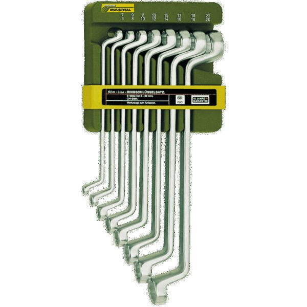 Raktų rinkinys su laikikliu su skyriais kiekvienam veržliarakčiui ir skylėmis tvirtinimui prie sienos. Visi raktai aiškiai sužymėti, todėl lengvai surandami.