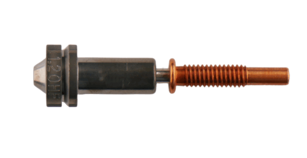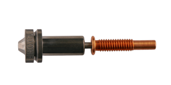 HF HT-A nozzles are high-temperature, high flow, abrasion-resistant nozzles. Much like ObXidian, these nozzles have a hardened steel tip, copper carrier and copper spreader segment to optimise the transmission of heat to the heatsink. The nozzle is then coated with Chromium Nitride to provide abrasive resistance, additional corrosion prevention and non-stick properties for printing up to 500°C