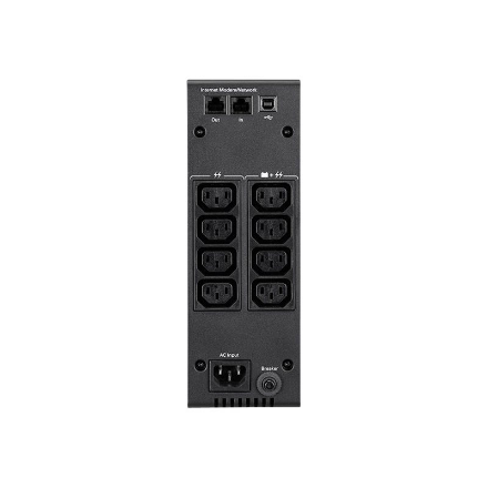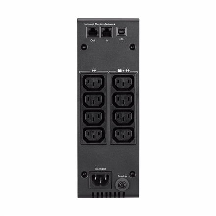 | Specialios funkcijos | Automatic Voltage Regulation (AVR); Saves space with a compact design that can be installed as a tower or under a computer monitor; HID-compliant USB port (cable supplied), for automatic integration with major operating systems (Windows/Mac OS/Linux); Data line protection to ensure that the internet line (including xDSL) is protected against surges; Easy to replace battery helps to extend UPS service life. |