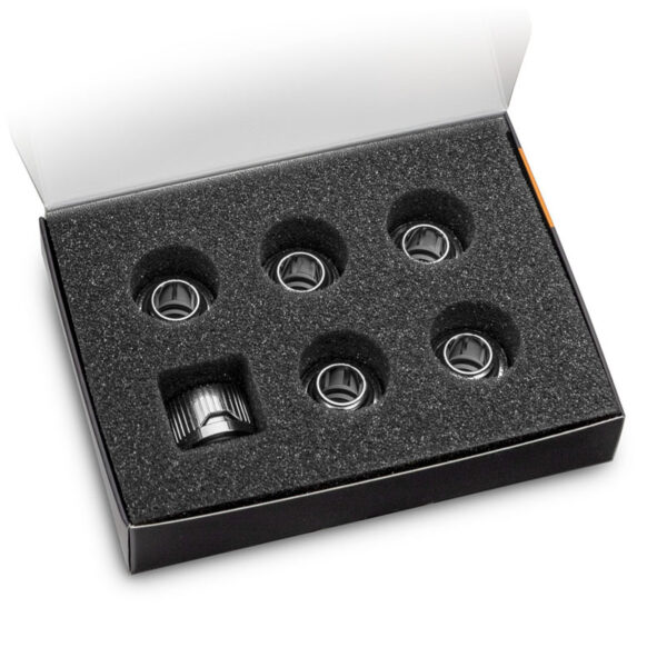 EK-Quantum Torque 6-Pack HDC 12 is a fitting multipack containing six EK-Quantum Torque HDC fittings. These are EK’s premium 12mm hard-tube compression fittings designed for use with solid tubing such as Acrylic and PETG. With a non-intrusive, yet striking look, and with NO added branding at all. They can be complemented by interchangeable aesthetic color rings, and are an ideal choice for anyone and a perfect match with EK-Quantum series products. To make sure they are undamaged in transport, they are packed in a box cushioned in black foam.