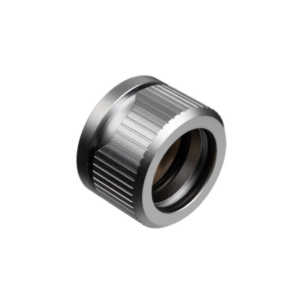 The locking ring prevents solid tube to be pulled out of the fitting by compressing the rubber gasket underneath the ring. The grooves on the outside allow for easier hand tightening. The compression ring has cutouts in EK Quantum signature shape allowing for the colored aesthetic ring to be shown. The colored rings are available in many colors and are screwed onto the fitting before the compression locking ring. The aesthetic rings are sold separately.
