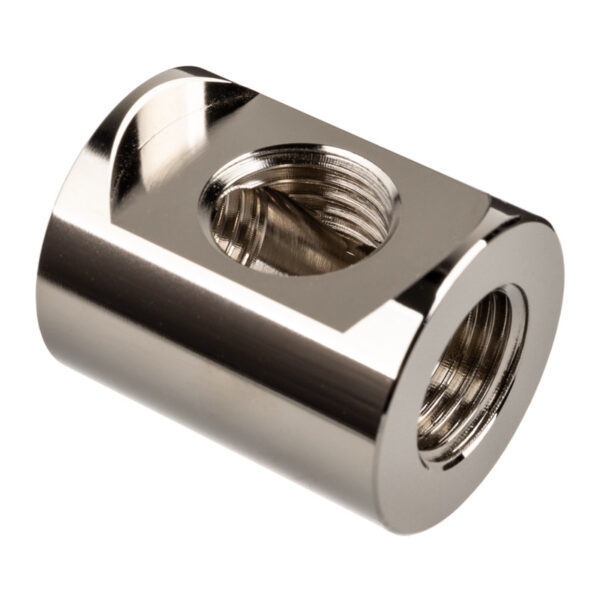 EK-Quantum Torque Splitter 3F T – Nickel is a simple cylinder-shaped adapter fitting with 3 (three) G1/4″ Female threads. This product is useful for splitting or combining the liquid flow in your loop.