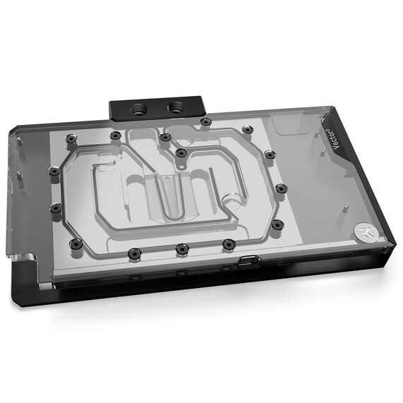 The top is made of transparent acrylic with integrated RGB lighting. The black backplate is made of aluminium, which also aids in heat dissipation. G1/4-inch connections allow for integration into your water cooling system.