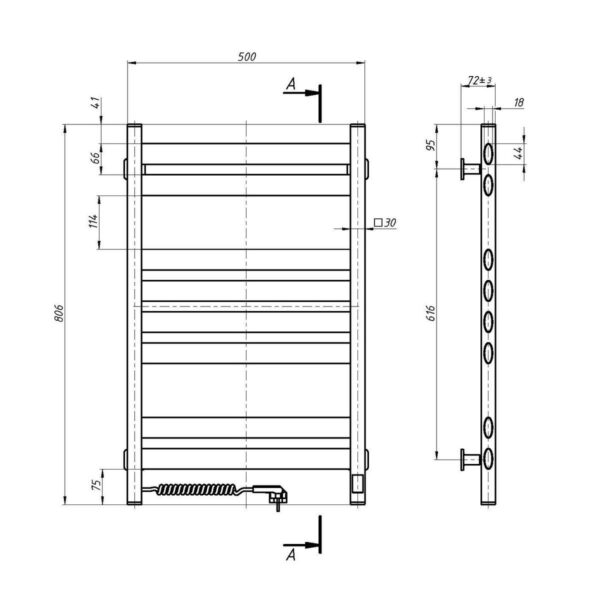 - Ukrainos gamintojo NAVIN šildomas rankšluosčių laikiklis Ellipse 500х800 Sensor (spalva – juoda muare; laido vieta su kištuku – kairėje) yra pagamintas iš anglinio plieno, kuris pasižymi aukšta kokybe ir ilgaamžiškumu. Modelis turi patikimą miltelinį dažymą. Džiovyklos šoninių kolektorių (stelažų) ir džemperių sienelių storis 1,5 mm.