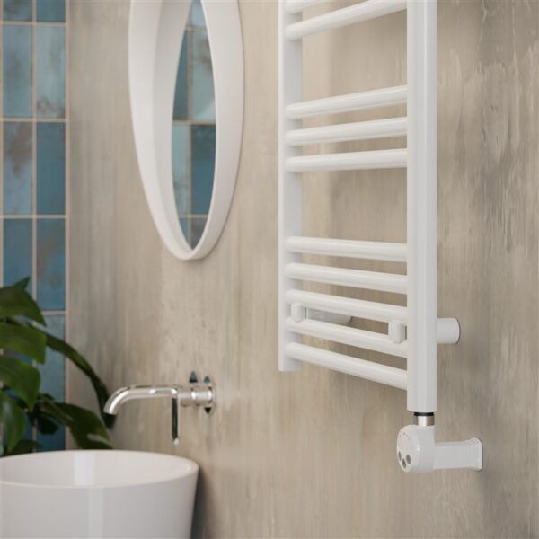 Prekės ženklas- Terma. Medžiaga- Plienas. Spalva- Balta. Aukštis- 83.7 cm. Plotis- 50 cm. Galia- 400 W. Maksimalus slėgis- 10 Bar. Sienelės storis- 0.125 cm. Laikiklių skaičius- 4. Privaloma garantija- 24 mėn. Papildoma informacija- Pajungimas – dešininis. Kaitinimo elementas – MEG. MEG kaitinimo elementas siūlo 5 temperatūros nustatymus nuo 30°C iki 60°C. Elektroninis temperatūros jutiklis garantuoja tikslų temperatūros valdymą. Prietaisas rodo šiuo metu nustatytą temperatūros lygį ir rodo šildymo ciklo būseną. Nutrūkus elektros tiekimui, MEG prisimena ankstesnius nustatymus, todėl yra tinkamas prijungti prie išorinių laikmačių ir išmaniųjų pastatų sistemų. MEG kaitinimo elementas turi apsaugą nuo užšalimo (ANTIFREEZE). Turi dvigubą apsaugą nuo radiatoriaus perkaitimo. MEG taip pat rodo įspėjimą gedimo atveju. Jis turi aktyvią saugos funkciją, kai naudojamas sausas radiatorius..
