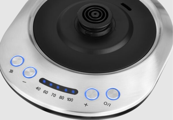 Dominuojantis pagrindo bruožas yra skaidrus, mėlynai apšviestas valdymo skydelis . Norėdami lengvai pasirinkti norimą temperatūrą, naudokite pliuso ir minuso mygtukus. Esami temperatūros nustatymai rodomi atitinkamais indikatoriais. Taip pat yra mygtukai virduliui įjungti arba temperatūros palaikymo funkcijai įjungti.