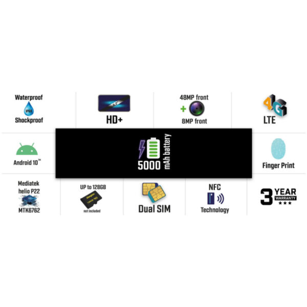 – Included: 1x Energizer HardCase H620S smartphone, 1x Charger, 1x Headphones, 1x Cable, 1x User manual
