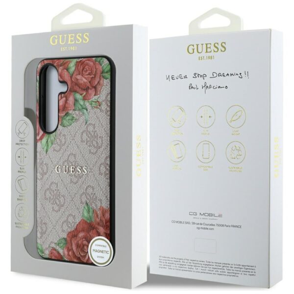 Guess Leather 4G Flowers Print Metal Classic Logo MagSafe Samsung Galaxy S25 dėkals telefonui rožinės spalvos