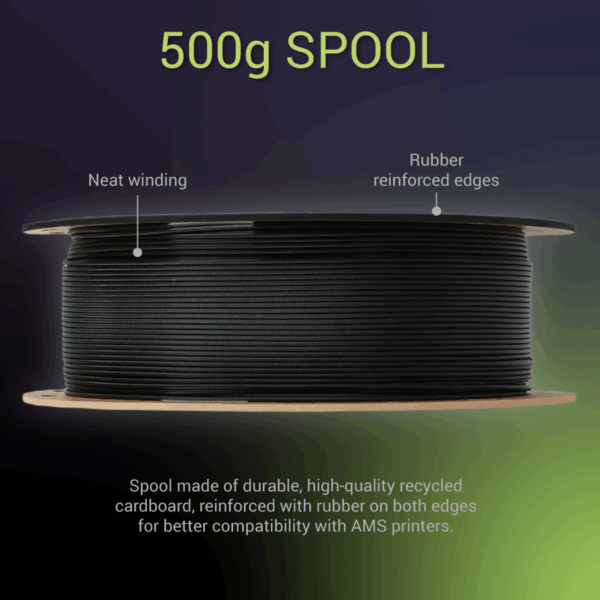 Spools are vacuum-sealed for dry, tangle-free dispensing and are AMS-compatible—ensuring smooth workflows in automated material systems. As a nylon, it is hygroscopic—storage in dry conditions and pre-print drying are recommended.