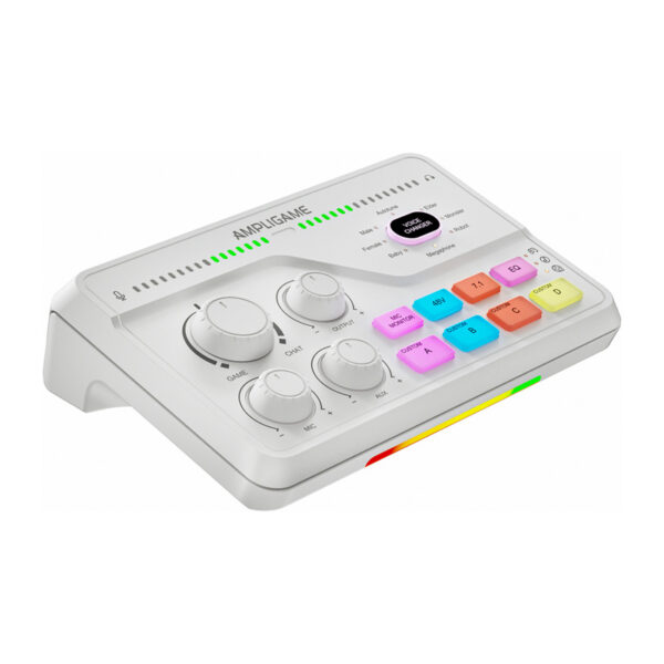 The Fifine SC8W RGB offers full support for XLR microphones and 3.5mm headsets. 50 dB of gain and 48-volt phantom power enable you to record a clear, crisp voice, even when using a more demanding condenser microphone. Three EQ modes further enhance the sound, and the built-in 8 voice modulation effects allow you to change the timbre in real time – from male and female voice, to baby effect, to robot or megaphone. It’s a tool that will easily bring your recordings to the next level of creative control.