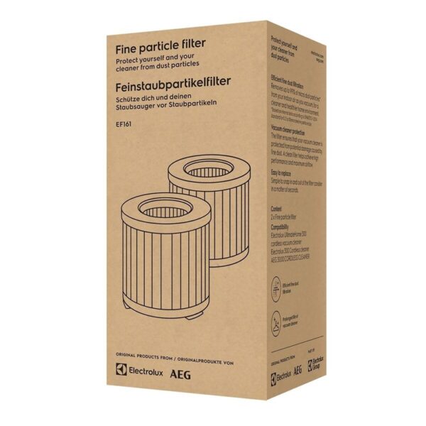 Prekės ženklas- Electrolux. Filtras- Popierinis filtras. Svoris- 0.068 kg. Medžiaga- Popierius. Vienetai pakuotėje- 2. Tinka modeliams- 300 serijos „Electrolux UltimateHome“ belaidžiam dulkių siurbliu,i 300 serijos „Electrolux“ belaidžiam dulkių siurbliui , 3000 serijos „AEG“ belaidžiam dulkių siurbliui.. Suderinami gamintojai- AEG, Electrolux. Papildoma informacija- Surenka iki 99 % dulkių mikrodalelių*, kad namų aplinka būtų švaresnė ir sveikesnė. Filtras užtikrina siurblio apsaugą nuo galimų pažeidimų, kuriuos sukelia smulkios dulkių dalelės. Švarus filtras padės pasiekti aukštą našumą ir maksimalų oro srautą. Vos per kelias sekundes, vienu spustelėjimu, įdėsite į filtro korpusą ar iš jo išimsite.* Dalelių dydis 0,3–10 µm. Rezultatai gauti atlikus vidinį bandymą, vadovaujantis EN60312-1:2014 standartu.. Komplekte- 2 smulkių dalelių filtrai.