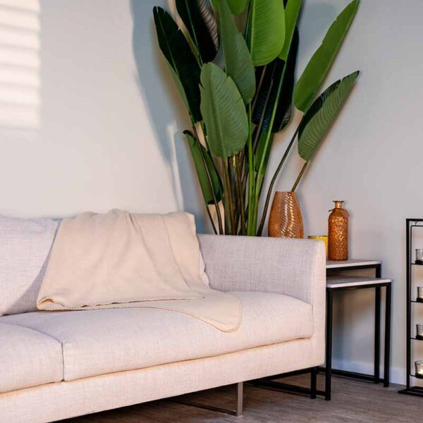 A warm, soft and tactile blanket made of soft fabric. A versatile product that will fit into any home interior as well as the backyard garden or balcony. It takes up little space, so you can take it with you when travelling or camping.
