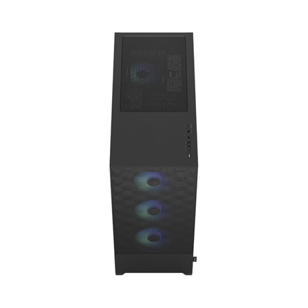 Stylish case in black by Fractal Design, side panel made of tempered glass, with front mesh & dust filters, four pre-installed 120mm RGB fans, high air & water cooling support, up to 7 drives out of the box, I/O panel with 2x USB 3.0 Type A / lighting control