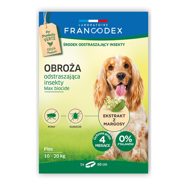 Apsaugokite savo šunį nuo blusų ir erkių natūraliai su FRANCODEX vabzdžių repelentu. Ši unikali apykaklė užtikrina efektyvią apsaugą iki 4 mėnesių, naudodama natūralių ingredientų galią. Sukurtas šunims nuo 10kg iki 20 kg, idealus sprendimas šuniukams nuo 3 mėnesių amžiaus, taip pat nėščioms ar žindančioms kalėms. Svarbiausi gaminio privalumai Natūrali apsauga nuo parazitų – antkaklyje yra maraka ekstrakto ir levandų aliejaus, kurie efektyviai atbaido blusas ir erkes, saugo šuns sveikatą ir komfortą. Ilgalaikis efektyvumas – vienas antkaklis užtikrina apsaugą iki 4 mėnesių, todėl tai patogus ir ekonomiškas sprendimas šunų savininkams. Saugus įvairioms šunų grupėms – Produktas gali būti naudojamas šuniukams nuo 3 mėnesių amžiaus, taip pat nėščioms ir žindančioms kalėms, kas patvirtina jo universalumą ir saugumą. Reguliuojamas ilgis – Dėl reguliuojamo dirželio, kurio diapazonas yra 2-60 cm, antkaklis lengvai prisitaiko prie šuns kaklo apimties, tuo pačiu užtikrindamas komfortą ir efektyvumą. Kaip vartoti Antkaklis turi būti išimtas iš pakuotės ir pritaikytas prie šuns kaklo apimties. Sureguliavus užsegimą, perteklinį dirželį galima nukirpti. Antkaklis pradeda veikti tuo momentu, kai jį uždeda ant gyvūno kaklo. Po panaudojimo rekomenduojama nusiplauti rankas. Nenaudoti šuniukams iki 2 mėnesių amžiaus. Sudėtis SUDĖTIS: Margozos ekstraktas (CAS 84696-25-3) 4,5-4,8g/100g, levandų aliejus (CAS 91722-69-9) 5g/kg. Kodėl verta rinktis FRANCODEX vabzdžius atbaidantį antkaklį? Išoriniai parazitai, tokie kaip blusos ir erkės, gali gerokai sumažinti šuns gyvenimo kokybę ir netgi sukelti sveikatos problemų. Su FRANCODEX vabzdžių atbaidymo antkakliu suteiksite savo augintiniui veiksmingą ir saugią apsaugą nenaudodami cheminių insekticidų. Tai puikus sprendimas savininkams, kurie vertina natūralią augintinio priežiūrą. Pasirūpinkite savo šuns ramybe ir sveikata pasirinkę FRANCODEX vabzdžių atbaidymo antkaklį – efektyvumas, saugumas ir patogumas viename!
