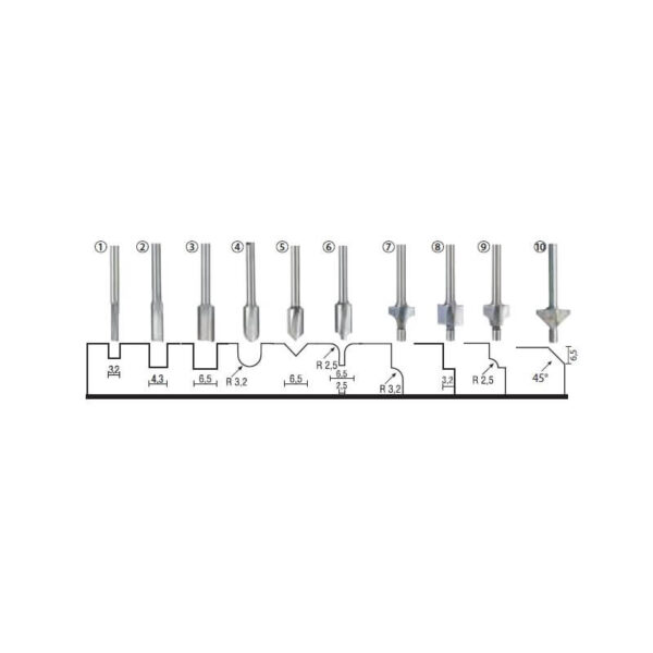 - Rinkinyje: frezavimo antgaliai grioveliams Ø 3,2 – 4,3 ir 6,5, išpjovoms Ø 6,4, V formos grioveliams Ø 6,5, išpjovos formos kraštams 6,5/2,5, ornamentinis R 3,2, juostinėms išpjovoms 6,4, 5 mm kraštams, 45° kampinė freza