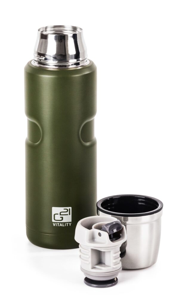- Didžiausias G21 termoso privalumas yra jo aukštos kokybės šilumos izoliacija. Nerūdijančio plieno termosas turi dvigubas sieneles ir puikiai sandarų dangtelį su išoriniu dangteliu. Taip gėrimai išlaikomi reikiamoje temperatūroje tikrai ilgai – karšti iki 12 valandų, šalti iki 24 valandų.