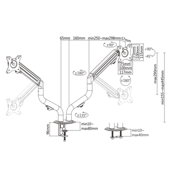 Gembird MA-DA2-02 Reguliuojamas stalas, 2 ekranų tvirtinimo rankena (pakreipta), 17″-32″, iki 8 kg