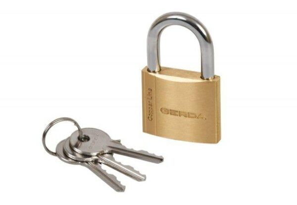 Pakabinama spyna COPPER LINE S50-S60, žalvarinė su lankeliu Spyna skirta bendrosios paskirties naudojimui bei turto ir mažesnės vertės daiktų apsaugai. Puikiai tinka sodo sklypams, sodams ar vartų bei vartelių užrakinimui. Techniniai parametrai: – korpusas pagamintas iš vientiso žalvario – lankelis iš grūdinto plieno – fiksatoriaus tipo užraktas, leidžiantis užrakinti spyną nenaudojant rakto – padidintas atsparumas korozijai – drenažo anga – dvipusis lankelio fiksavimas (nuo S40 dydžio ir didesnių) – komplekte: trys nupjauti raktai