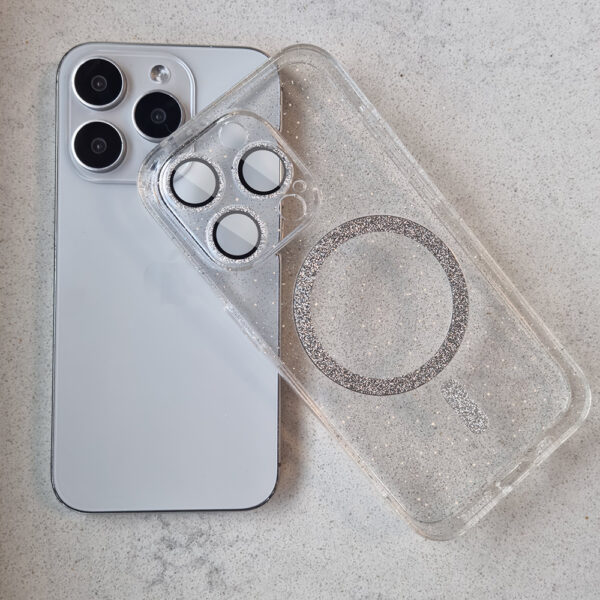 Glitter Magsafe Case – is a shimmering case made of flexible TPU material (sides) and hard Acrylic (back). The case protects the back, sides, camera and screen of the smartphone. Magnets built into the case make it compatible with Apple MagSafe accessories.