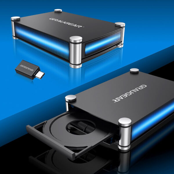 The GRAUGEAR G-5251 supports 5.25″ Blu-Ray/DVD/CD drives. With this external case, an internal 5.25″ SATA drive becomes your externally usable “partner” for notebooks, PCs, etc. that no longer have optical drives. The robust aluminum case is stylishly highlighted by the blue LEDs on three sides. The case is connected via a USB 3.0, or the eSATA port and is put into operation via the on/off switch. To use the new USB Type-C ports, a corresponding Type-C to Type-A adapter is also included.