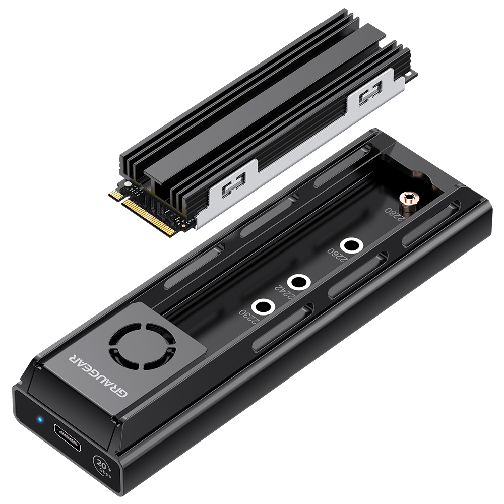 Stylish docking station for M.2 SSDs, for M.2 SSDs without installation in PCs, prevents thermal throttling, with 20mm fan, connection via USB-C 3.2 Gen 2, speeds up to 20 Gbps