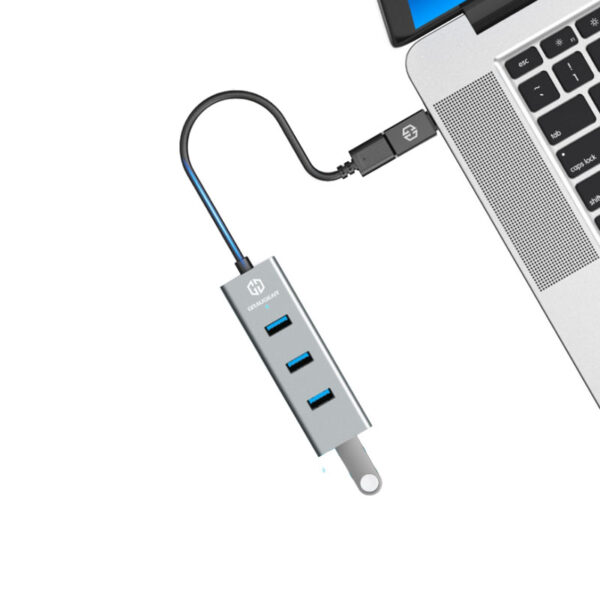 USB hub, robust and lightweight aluminium housing, up to 5 Gbit/s data throughput, connection for four USB devices, including adapter to USB-C