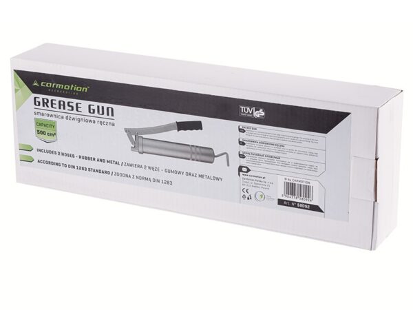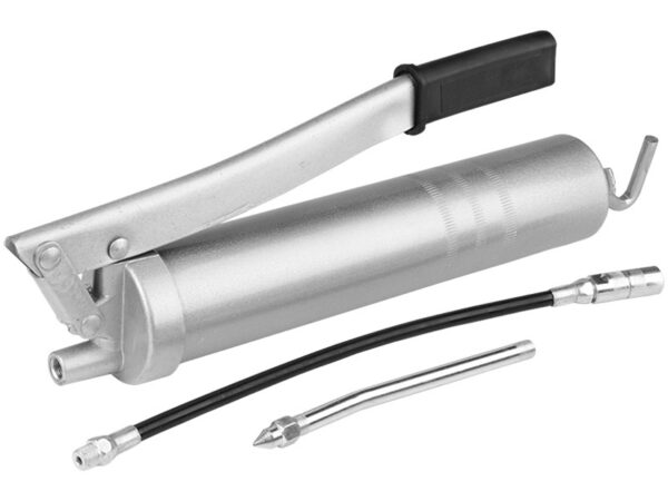 Grease gun is used to apply grease through a special tip that ensures accuracy. Designed for the lubrication of mechanical elements under high pressure exposed to high levels of abrasivee and mechanical wear (bearings, shafts, gears). An indispensable device in a car workshop, tire service and home garage. It is made of damage-resistant metal, and a rubber seal is used in the piston. Set includes two hoses – rubber and metal.