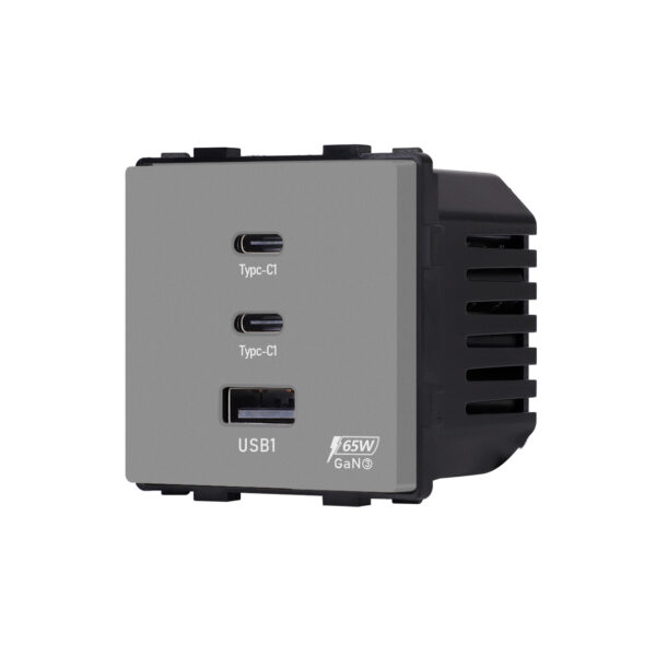 Pilkos spalvos 65 W greito krovimo rozetė Feelspot FSMP65G kartu su USB ir dviejomis C tipo jungtimis. Greito krovimo rozetė parduodama be rėmelio.