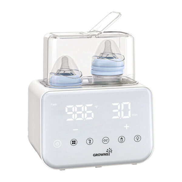 The Grownsy double bottle warmer has been designed with the everyday needs of parents in mind, who want to prepare milk for their baby quickly and safely. The large, double chamber allows you to heat two bottles or milk bags at the same time, and with as many as 10 functions – from quick steam heating, water bath, defrosting, sterilization, and meal heating, to precise temperature control and a timer – you have full control over every feeding at any time of the day or night.