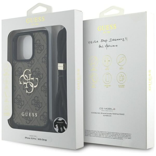 GUESS dėklas skirtas Apple iPhone 16 Pro GUHCP16LP4GMGCRW (CBDY PU 4G Big Logo W/Cord Strap) rudos spalvos