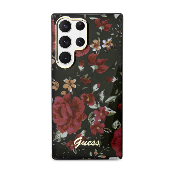 Guess Flower Collection case made from durable TPU. It provides your phone with the best protection against scratches, shocks, dust and possible drops. The design is decorated with a floral motif. There is a large Guess logo at the bottom.