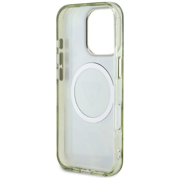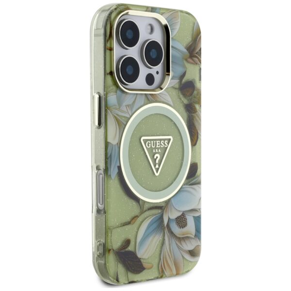 Guess Glitter Flowers Triangle Buttons MagSafe Apple iPhone 16 Pro Max dėklas telefonui žalios spalvos