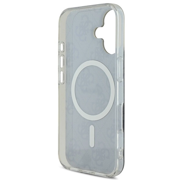 Etui wyróżnia się wyjątkową elegancją, której kwintesencją są dopracowane detale, takie jak złota ramka wokół aparatu oraz stylowy złoty pierścień MagSafe. Wysokiej jakości print 4G, będący ikoną stylu Guess, nadaje pokrowcowi klasyczny, ponadczasowy wygląd. Wewnątrz magnetycznego pierścienia subtelnie wkomponowano także logo Guess, perfekcyjnie współgrające z kolorystyką pokrowca, tworząc harmonijną i spójną całość.