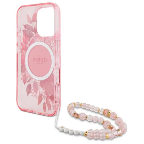 Guess IML Flowers With Pearl Strap MagSafe – dėklas skirtas Apple iPhone 16 Pro Max Pink
