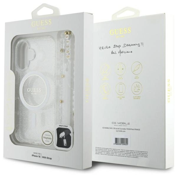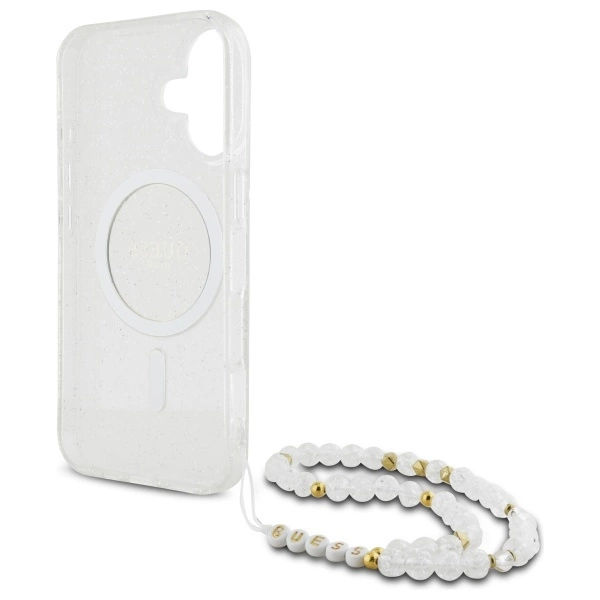 Guess IML Glitter With Pearl Strap MagSafe Apple iPhone 16 Plus Case – dėklas telefonui skaidrus