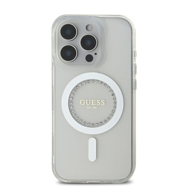 Guess IML Rhinestones Ring MagSafe Apple iPhone 16 Pro dėklas telefonui baltos spalvos