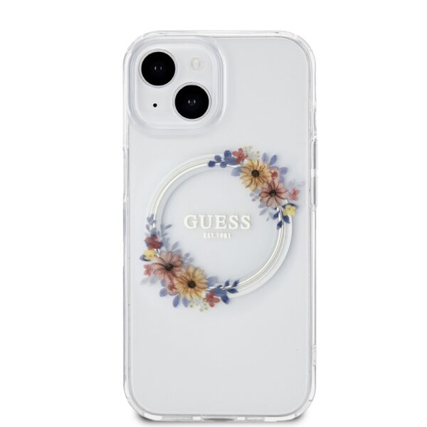 Guess PC/TPU Flowers Ring Glossy Logo MagSafe dėklas skirtas Apple iPhone 15 Plus skaidrus